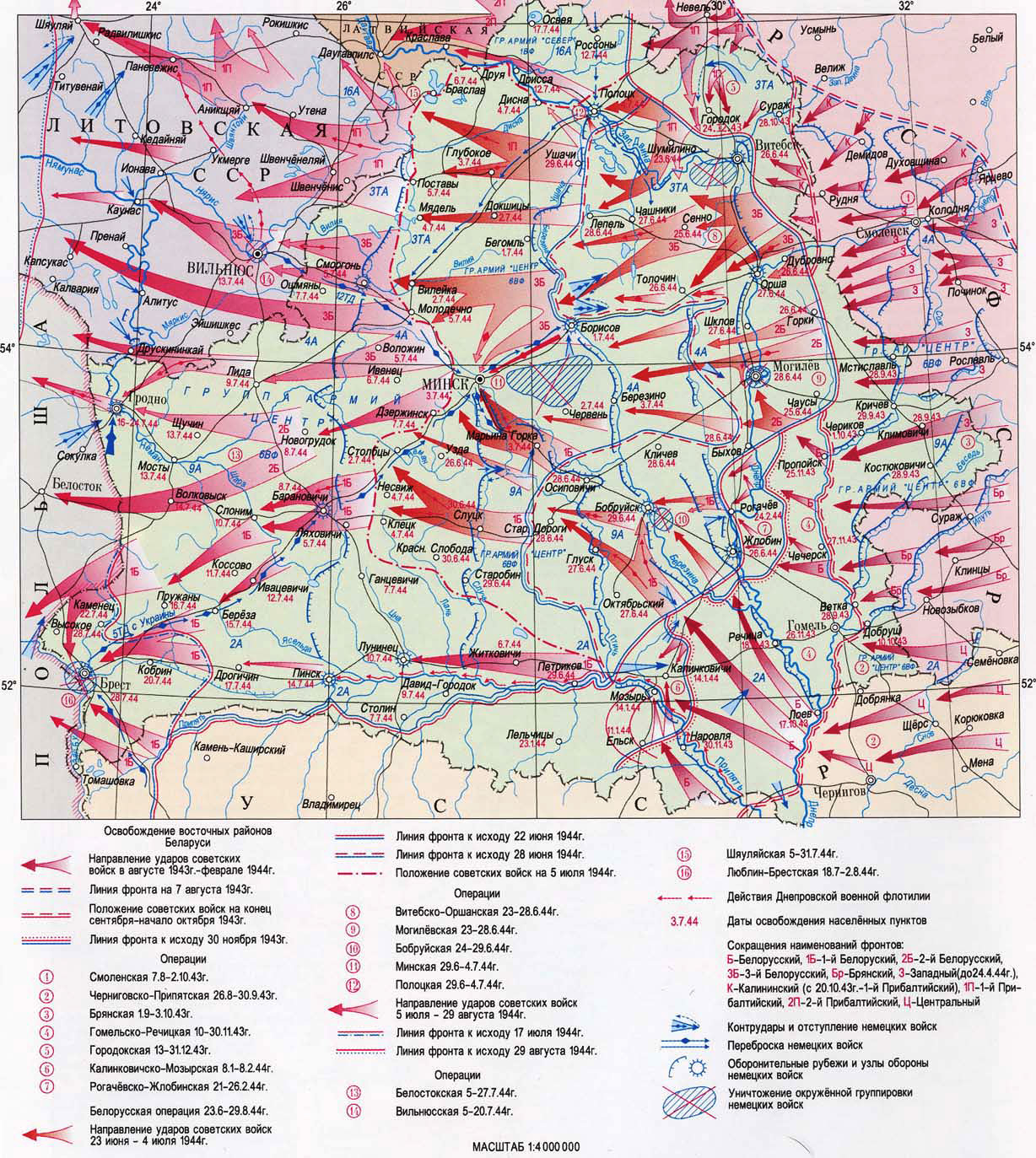 Белорусская наступательная операция под кодовым названием “Багратион” началась 23 июня, завершилась 29 августа 1944 года. Замысел ее состоял в том, чтобы одновременными глубокими ударами на шести участках прорвать оборону противника, расчленить его войска и разбить по частям.